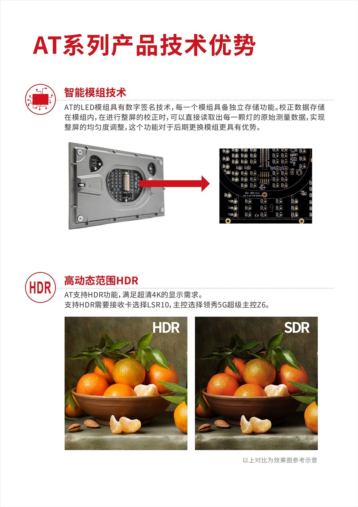 AT系列智能商顯小間距LED顯示產品,具有超薄、超輕的結構,超清4K、HDR的顯示效果。產品支持掛裝、座裝等多種安裝方式,可以搭建出平面或者弧形曲面等多種效果的屏幕,是商業零售、高端會議、智能交通等商顯應用的最佳選擇。